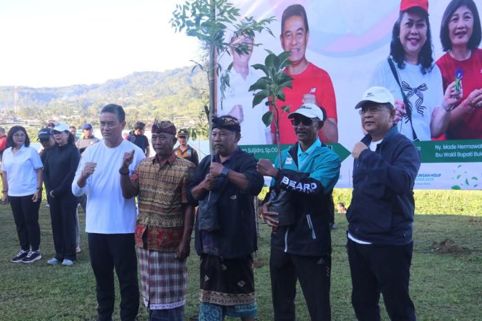 Bupati Buleleng, I Nyoman Sutjidra bersama Wakil Bupati Buleleng, Gede Supriatna didampingi Sekretaris Daerah Kabupaten Buleleng, Gede Suyasa serta Forkopimda dan OPD di lingkup Pemkab Buleleng pada kesempatan ini hadir dan ikut melakukan penanam bibit pohon serta restocking benih ikan nila di perairan Danau Buyan.