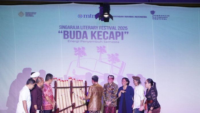 Buleleng, Laksara.id – Sejak dibuka pada 25 Juli 2025 di Sasana Budaya, Singaraja, Bali, oleh Direktur Jenderal Pengembangan, Pemanfaatan, dan Pembinaan Kebudayaan Kementerian Kebudayaan RI Ahmad Mahendra bersama Wakil Bupati Buleleng Gede Supriatna, ditemani pendiri Singaraja Literary Festival (SLF), Kadek Sonia Piscayanti dan Made Adnyana Ole, SLF berlangsung , sublim, intim, dan penuh kesadaran. Ini terlihat dari kawasan Gedong Kirtya dan Fakultas Bahasa dan Sastra Universitas Pendidikan Ganesha—tempat terselenggaranya SLF selalu dihadiri pengunjung yang saling mengenal dan saling mendukung. Selama tiga hari (dari 25-27 Juli 2025), tempat-tempat lokakarya, pameran seni, dan diskusi berlangsung penuh kesadaran dan makna. Pengunjung datang dan pergi mengalir dalam kehangatan seperti telah memilih takdir masing-masing.