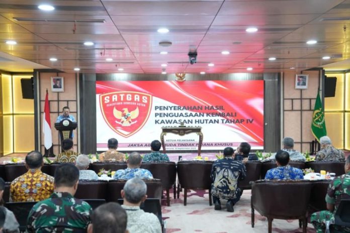 Jakarta, LAKSARA.ID – Menteri Pertahanan (Menhan) RI, Sjafrie Sjamsoeddin, menyaksikan Penyerahan Kawasan Hutan Tahap IV dari Satuan Tugas (Satgas) Penertiban Kawasan Hutan (PKH) kepada PT Agrinas Palma Nusantara (Persero), di Kantor Kejaksaan Agung Jakarta, pada Jumat (12/9/2025). Acara yang berlangsung di Kejaksaan Agung ini menegaskan dukungan penuh dari Kemhan terhadap upaya pemerintah untuk mengambil kembali aset-aset negara yang dikuasai secara ilegal.